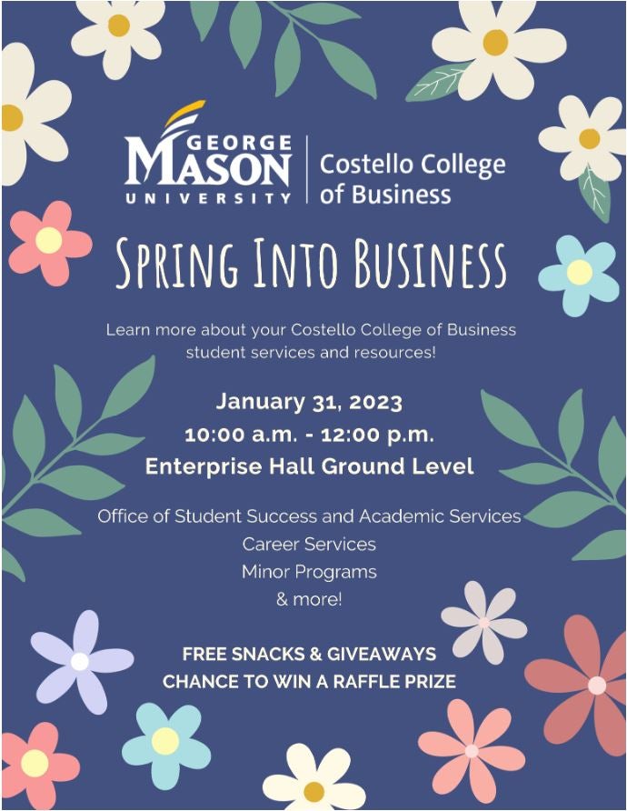 The Costello College of Business Academic Advisors will be hosting their annual "Spring Into Business" inviting all College of Business students to join them in having snacks, winning raffle prizes, and to learn about the different opportunities and resources available in the College of Business. Event details are below: