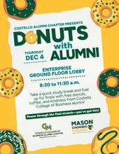 Take a quick study break and fuel up for finals with free donuts, coffee, and kindness from Costello College of Business alumni! Join us on Thursday, December 4 from 8:30am-11:30am in Enterprise Hall Ground Floor Lobby.