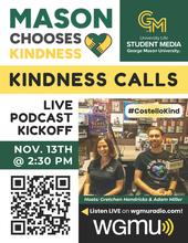 Mason Chooses Kindness: Celebrate World Kindness Day by joining Costello College of Business professor Gretchen Hendricks and business management student Adam Miller, as they co-host a new LIVE podcast, Kindness Calls, on WGMU radio on Thursday, November 13 at 2:30 p.m. with live guests ready to share how they are championing kindness on the Mason campus and beyond.