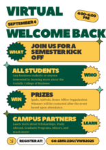 Join us at the 2025 Virtual Welcome Back! Raffle prizes from AirPods to iPads and great opportunities to learn about campus opportunities such as scholarships and minors.